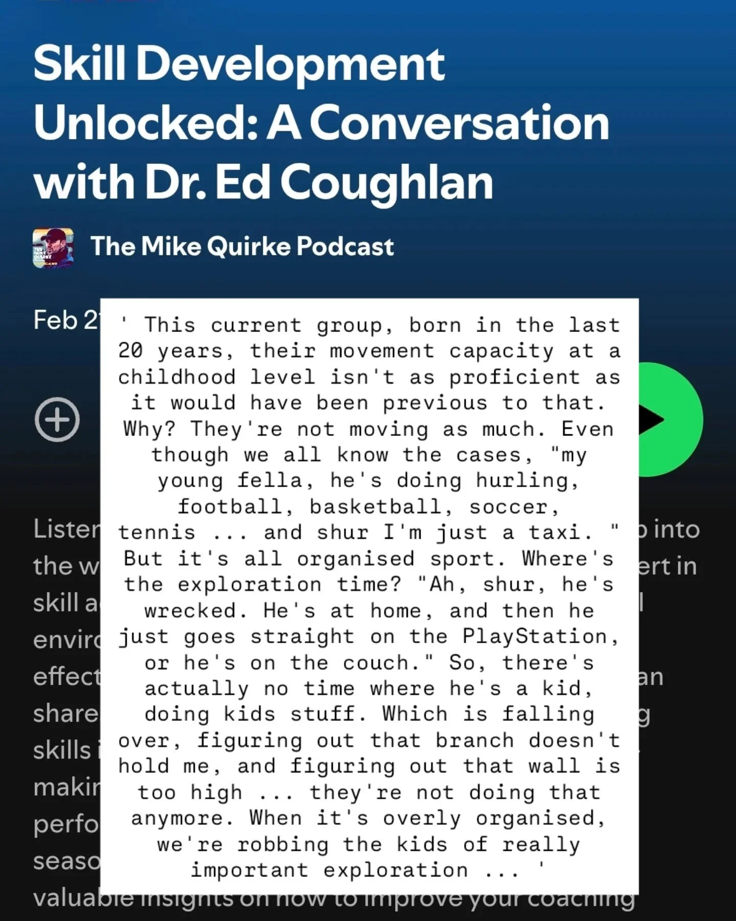 ' This current group, born in the last 20 years, their movement capacity at a childhood level isn't as proficient as it would have been previous to that. Why? They're not moving as much. Even though we all know the cases, "my young fella, he's doing hurling, football, basketball, soccer, tennis ... and shur I'm just a taxi." But it's all organised sport. Where's the exploration time? "Ah, shur, he's wrecked. He's at home, and then he just goes straight on the PlayStation, or he's on the couch." So, there's actually no time where he's a kid, doing kids stuff. Which is falling over, figuring out that branch doesn't hold me, and figuring out that wall is too high ... they're not doing that anymore. When it's overly organised, we're robbing the kids of really important exploration ... ' Dr. Ed Coughlan.
